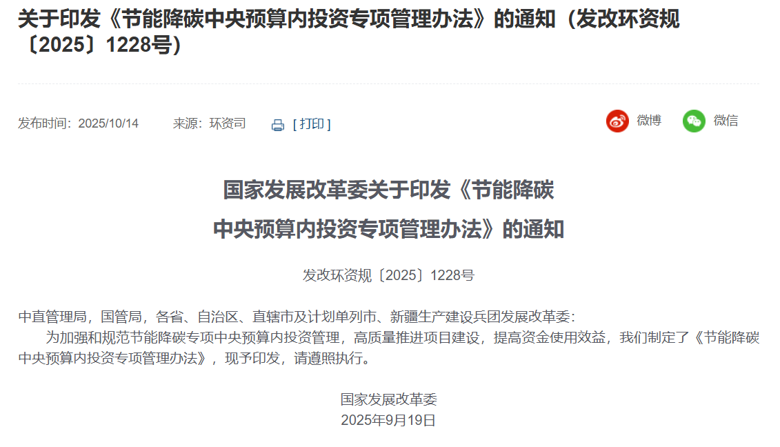 10月14日消息,國家發展改革委近日印發《節能降碳中央預算內投資專項管理辦法》(以下簡稱《管理辦法》)。 辦法指出,支持電力、鋼鐵、有色、建材、石化、化工、機械等重點行業節能降碳改造。支持以工業園區、產業集群為載體整體部署并規模化實施的節能降碳改造。支持供熱、算力等基礎設施節能降碳改造。支持中央和國家機關節能降碳改造。
